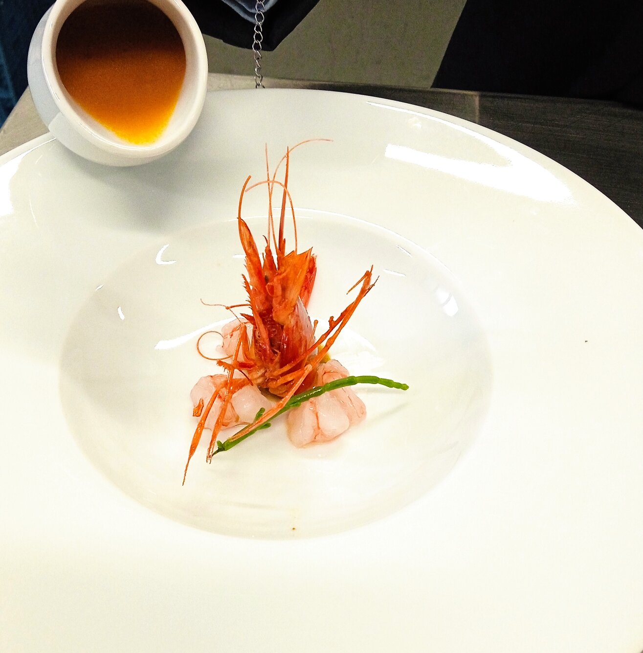 Gamba roja de Vilanova i la Geltrú al natural con su cabeza salteada y su consomé.